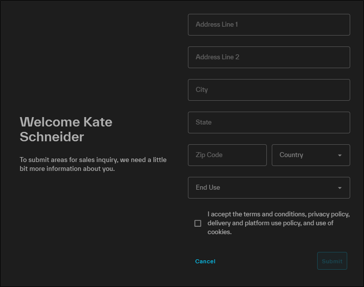 If you are a new user (created after the release of version 1.3) and you have not yet submitted an order, the Welcome dialog opens. This dialog gathers additional registration information needed for your Discover account before you can add areas to your cart.