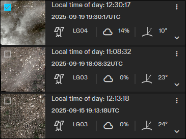 In this example, the filter identifies imagery with a collection start time between 9/19/2023 and 9/19/2025, beginning at 12:00:00 UTC and ending at 11:59:59 UTC. The filter also identifies imagery collected on those dates with a local time between 12:00:00 and 11:59:59.