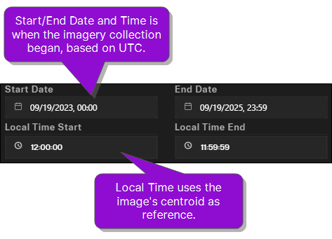 to filter based on the time imagery collection began (based on UTC).Local Time Start / Local Time End Use the arrow pickers to set the local start and end times. Local time uses the image’s centroid as the reference.