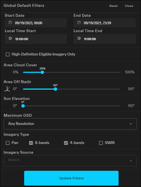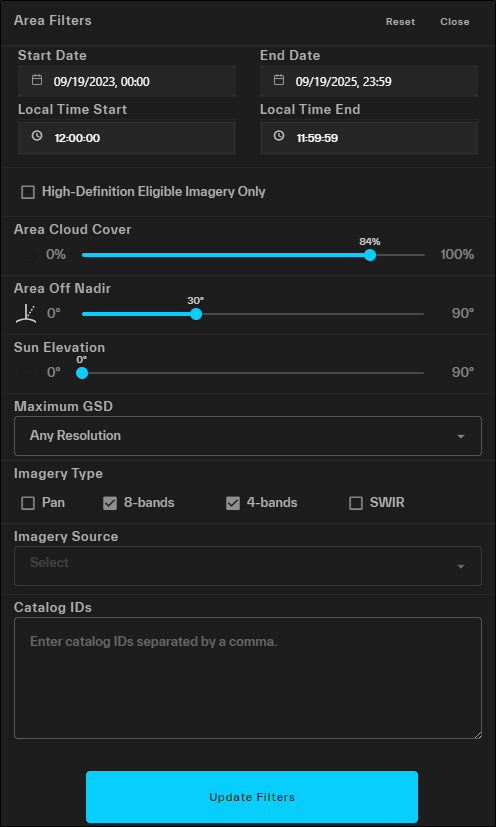 When you select High-Definition Eligible Imagery Only, the available ranges for GSD, Area Off Nadir, and Sun Elevation automatically adjust to ensure the best possible imagery results.