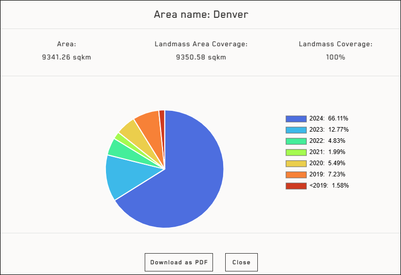 , then select Show Vivid Age Chart. In the dialog that opens, view the mosaic metrics and a pie chart of the imagery ages by year.Area (km2) Total mosaic area that intersects the AOI