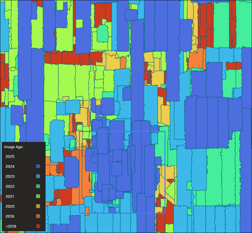 The age of each image displays on the map. Use the Image Age legend at the bottom of the viewport to determine the age of the imagery.